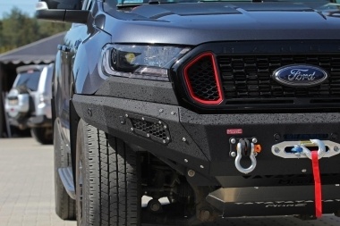 De stalen voorbumper van de More 4x4 Ford Ranger is gemaakt van 6, 4 en 3 mm dik staal . Hij is soepel in drie richtingen verstelbaar, wat de installatie in het voertuig aanzienlijk vereenvoudigt.