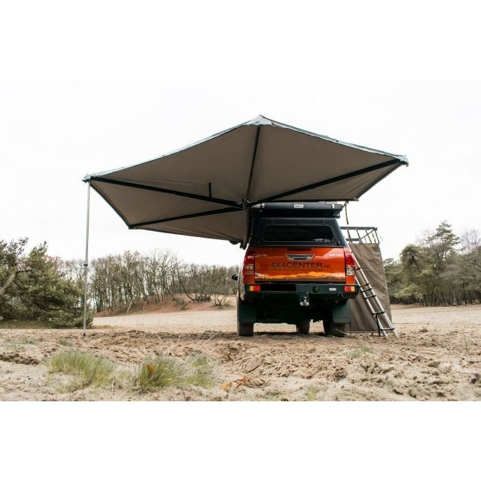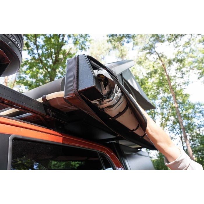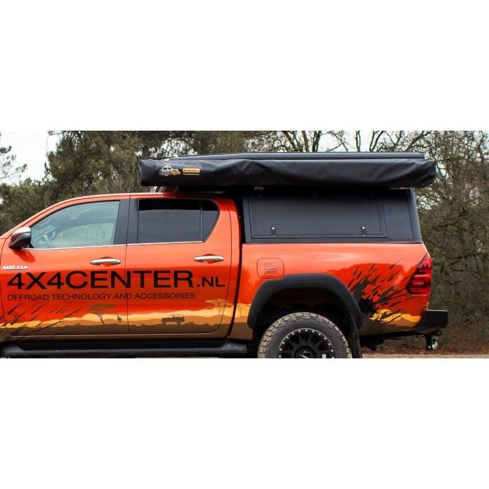 De luifel is in ingeklapte toestand opgeborgen in een aluminium box met een extra hoek aan de voorkant. De extra hoek beschermt het canvas tegen de armen die, bij offroad rijden, kunnen bewegen en hierdoor door het canvas zouden kunnen schuren.