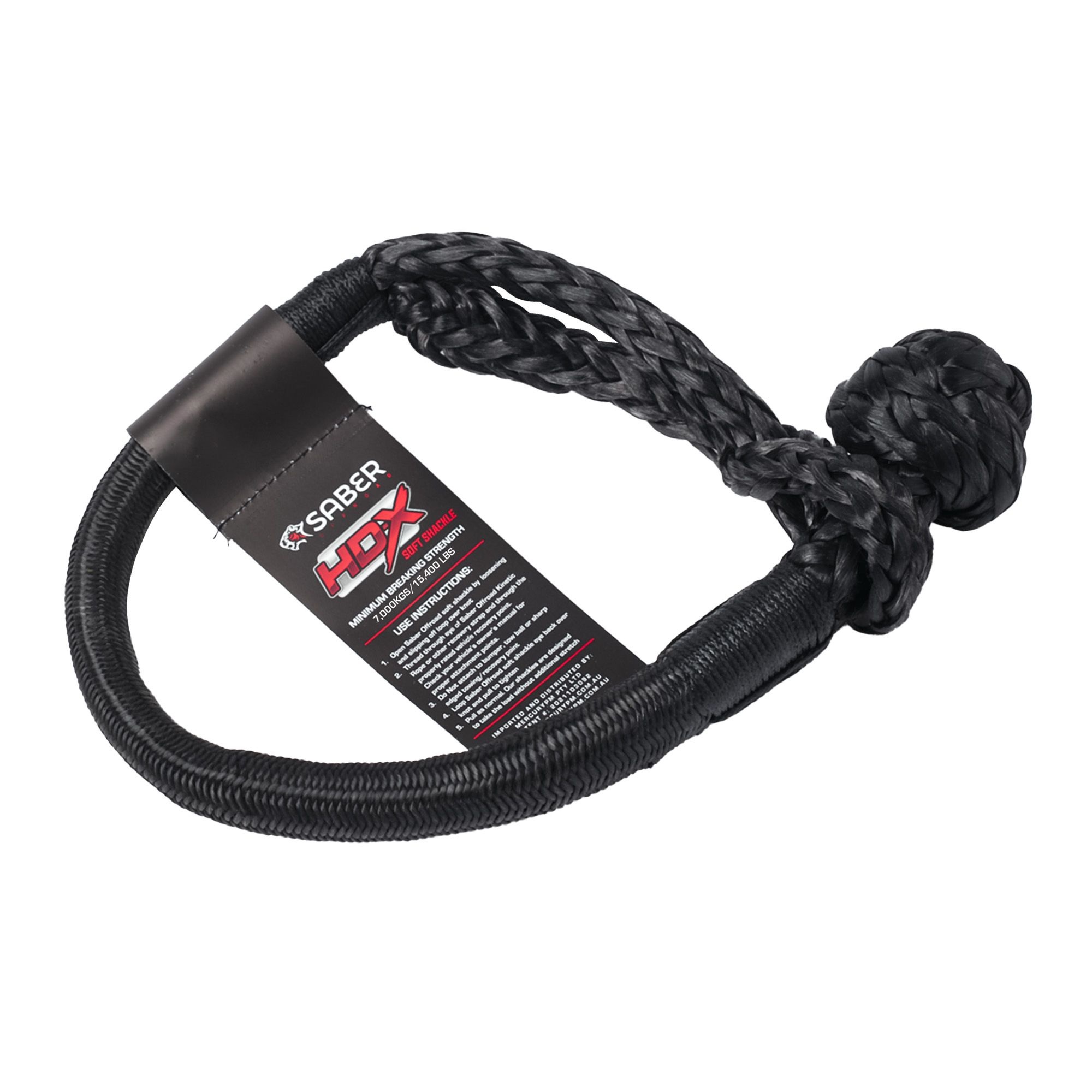 The kinetic recovery rope is made from Nylon 66, enhanced with a unique outer treatment that protects against UV rays, moisture and abrasive substances such as dirt and sand. The eyes of the rope incorporate a soft yet durable vinyl polymer coating for focused protection where wear is greatest. The soft shackles feature a proprietary SaberPro fibre core with a Technora binding that provides cut resistance and added durability.